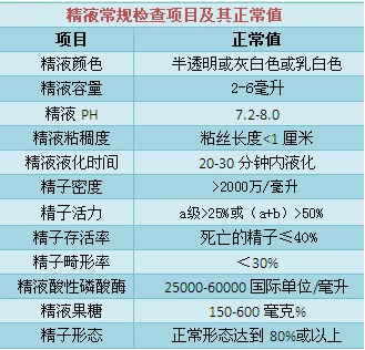 河池曙光男科医院医生介绍说,精液常规检查是泌尿外科、男科、生殖科简便普及的化验室检查方法之一,也是妇科经常参考使用的重要参数之一。精液的常规检查主要内容有:精液量、颜色和透明度、粘稠度和液化时间、酸碱度(PH值)、精子成活率、精子活动能力、精子密度、精子畸形率等精液的各项正常参考值如下图: